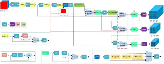 Despite the good engineering practicability of YOLOv5, there are still challenges with the detection of tiny and dense objects. Consequently, YOLOv5 is improved by this research. By using the coordinate attention module and the bidirectional feature pyramid network, it is possible to more efficiently extract the feature data of tiny and dense objects, as well as to improve the multi-scale fusion of the prediction feature layer, which enhances the model’s detection performance. Figure 2 demonstrates the improved YOLOv5′s structure; the improved modules are marked with red boxes and red lines in the figure.