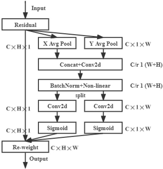 As demonstrated in Figure 3, CA encodes channel relationships and long-term dependencies via accurate location information, which involves two steps: coordinate in-formation embedding and coordinate attention generation. A coordinate attention module can be regarded as a computing unit that enhances the ability to express features. It can take any intermediate feature vector ( is the number of channels, and and are the height and width of the image, respectively) as input and output a tensor of the same size with enhanced representation ability.