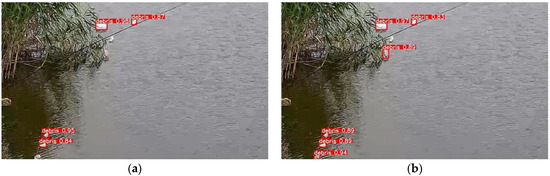 The CA module is a novel and efficient attention mechanism that can improve the accuracy of the network without incurring any additional overhead. The original author of CA applied it to EfficientNet and MobileNet, and they have both seen positive outcomes. To this purpose, this study adds it to the backbone of YOLOv5. The comparison of the detection results is presented in Figure 4 below. Figure 4a demonstrates the YOLOv5’s detection findings. Three false negative objects can be found in the lower left and center of the image, and Figure 4b displays the outcomes after integrating the coordinate attention mechanism. The floating debris was precisely recognized in the middle and the bottom left corner of the image. It can be observed that the attention mechanism can cause the network model to pay attention to tiny objects across a wider range, improving the network’s detection ability.