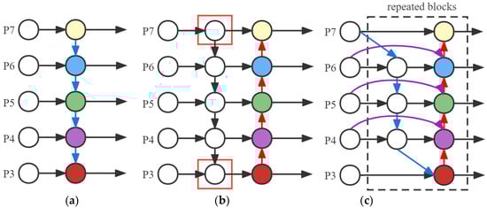 Bidirectional feature pyramid network (BiFPN) [36] is a new feature fusion method proposed by the Google Brain team. It adopts efficient bidirectional cross-scale connection and weighted feature fusion. It is developed from feature pyramid networks (FPN). Figure 5a shows the structure of FPN. This structure establishes a top-down path for feature fusion and uses the fused feature layer with more semantic and geometric information for prediction. Although FPN transfers deep semantic information to shallow layers, the location information of deep features is still relatively poor. Therefore, path aggregation networks (PANet) establish a bottom-up route on the basis of FPN, and communicates the underlying location information to the prediction feature layer, so that the prediction feature layer has both the semantic information of the top layer and the position information of the bottom layer. This can greatly improve object detection accuracy.