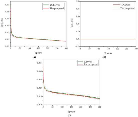 We compare the proposed network’s floating object detection performance to that of several other state-of-the-art approaches, including Faster R-CNN, SSD, YOLOv3, and YOLOv5s. The Faster R-CNN is a typical two-stage object detector, while the others are single-stage object detectors. To ensure fairness, when training YOLOv5 and improving YOLOv5, the parameter settings for both are same. Both use the SGD optimizer to train the network on the SWFD dataset; the momentum is 0.937, the weight decay is 0.0005, the batch size is 16, and the learning rate is 0.01. It should be mentioned that all models employ the same training and test sets, as well as 300 iterations. Experiments with floating debris detection were carried out on a PC with an Intel Xeon Gold 5218 @ 2.30 GHz, Tesla T4, and 64 GB of RAM. Our model is built on the Pytorch deep learning framework, using Python as the programming language, and CUDA11.4 and CUDNN8.2.2 as the GPU accelerators. The loss comparison curve of YOLOv5 and the improved YOLOv5 is obtained from the log files saved during the training process, as shown in Figure 6.