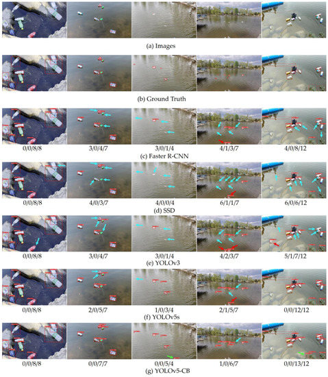 On the SWFD test dataset, Figure 7 demonstrates the detection results of our method and other models. We only detected floating debris on the surface of the water in the experiment, and we did not distinguish between different categories of debris. As shown in Figure 7, all strategies can provide better results for large and clear debris (shown in the first column). However, our method generates results that are closer to the ground truth than the other four methods for small objects (as shown in the second column), extremely small objects (as shown in the third and fourth columns), and dense objects (as shown in the fifth column). YOLOv5s (see Figure 7f) is currently an excellent detection algorithm with good engineering practicability, but it still has significant shortcomings in the recognition of small and even extremely minute objects. By combining the feature information of multiple layers, YOLOv3 provides three feature maps of different scales for reasoning, however it still delivers unsatisfactory results for small object detection, with many false positive and false negative results. Furthermore, Faster R-CNN, and SSD produced disappointing results, including some false positive and false negative results. Our approach is particularly exciting since it discovers objects that are not in the ground truth. With a higher overlap rate between our detections and the ground truth, these results demonstrate the strength of our method. Moreover, the SWFD dataset has a large number of small objects, enabling our method to detect small and extremely small objects.