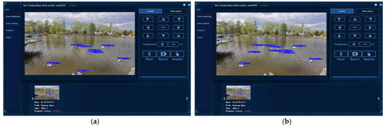 Figure 9 shows the real-time detection of video streams by YOLOv5 and YOLOv5-CB. The detection results are sent to the server and brought to the front-end when the edge machine has finished its detection task. When floating debris is discovered, an automated cleaning task is created and sent to the unmanned cleaning vessel or the accountable party. It has been confirmed that the system enables the smart integration of video recorder equipment access, edge machine inference calculation, and front-end visualization, which significantly boosts the monitoring and cleaning efficiency of floating debris and serves as a certain benchmark for the design of cloud-edge collaboration architecture.
