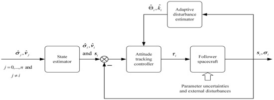 respectively, in a fixed time . This completes the proof of Theorem 3. In summary, the control algorithm designed in this paper includes fixed-time state estimators that can be applied in a directed communication topology, adaptive control law, and fixed-time attitude tracking control algorithm. The schematic diagram of the control law is shown in Figure 1.
