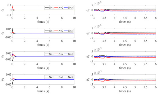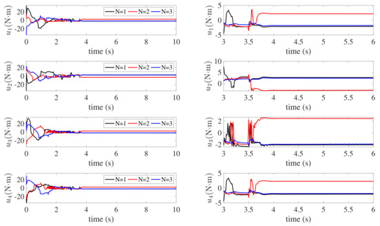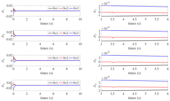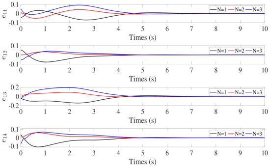 According to the simulation results, the proposed control law can successfully accomplish attitude synchronization with accuracy and stability in the presence of external disturbances and parameter uncertainties. As shown in Figure 5 and Figure 6, converges to the region , and converges to the region . converges to the region , which is shown in Figure 7. In Figure 4, the attitude tracking error converges to within 4 s. The attitude of the leader spacecraft is dynamic; therefore, the control torques continue to exist in the control process, as illustrated in Figure 8. The simulation results demonstrate the effectiveness of the fixed-time state estimator and fixed-time attitude cooperative control law designed for SSF under the directed graphs in this paper.