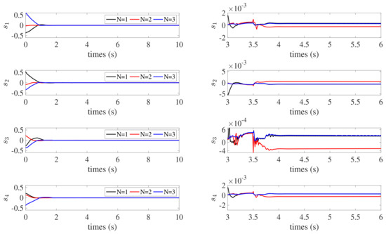 Notably, the design of parameter here aims to avoid the singularity of the auxiliary variable , and parameter directly affects the convergence accuracy of the system. Therefore, should be reasonably adjusted according to the actual control process. Designing as a small permissible constant ensures that and while preventing the singularity problem from occurring. Thus, the states of the system converge to a small permissible range of the equilibrium point within a fixed time. Then, after , we obtain