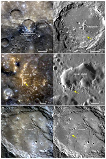 For morphological study, monochrome images (central wavelength of 750 nm) that were obtained at various incidence angles by the Narrow-Angle Camera (NAC) and Wide-Angle Camera (WAC) of the Mercury Dual Imaging System (MDIS) [30] were used because of better resolutions. Both single frames (pixel scales as good as 100 m/pixel for WAC images and 15 m/pixel for NAC images) and global mosaics (pixel scales as good as 166 m/pixel) of MDIS images were considered, and the USGS Integrated Software for Imagers and Spectrometers was used to process the data following a standard pipeline with an updated photometric model [31]. We performed a global evaluation of whether or not inside depressions in pyroclastic deposits can be classified as a pitted-ground terrains based on various MDIS WAC global color mosaics, including the enhanced MDIS color mosaic that was built on principle component analyses [31] and locally constructed color mosaics (Table S1 in Supplementary Materials).