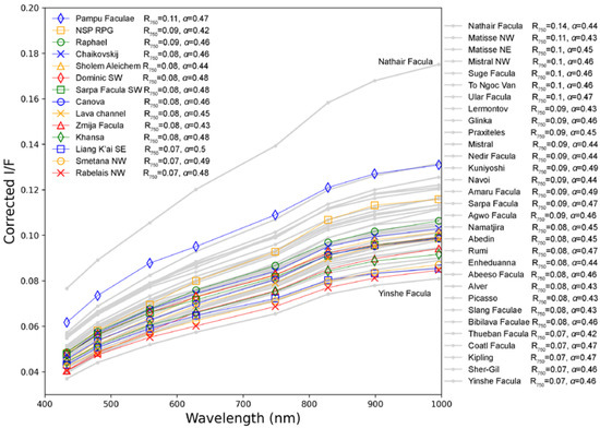 Comparison of reflectance spectra of pyroclastic deposits formed by pitted-ground terrains and the other typical explosive volcanoes on Mercury. The spectral data are acquired from the eight-band global color mosaic [31]. Spectral anomalies developed around typical explosive volcanoes marked by grey lines, and those developed around pitted-ground terrains are marked in other colors (see legend). R750 is the reflectance of 750 nm and α is the spectral slope at visible to near-infrared wavelengths as represented by R430/R1000 [38]. The spectra of the other typical pyroclastic deposits on Mercury are sorted up to down by values of R750. The spectral sampling locations are shown in the Figures S1–S7 of Supplementary Materials.