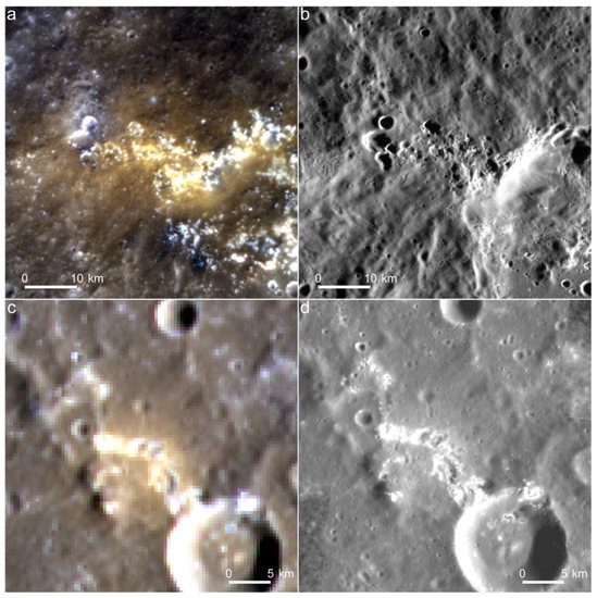 Examples of pitted-ground volcanoes on Mercury. The first column shows color mosaics, and the second column shows monochrome mosaics for the two examples. (a,b) The pitted-ground volcano around the Canova crater. (c,d) The pitted-ground volcano located in the Chakovskij crater. IDs of the base data used are listed in Table S1.