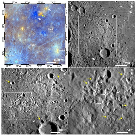 A young pitted-ground volcano in the floor of the Raphael crater (D = 342 km; central coordinates are 20.4°S, 283.7°E). (a) Color mosaic shows a patch of reddish pyroclastic deposits (yellow arrow) on the southern floor of the Raphael crater. The two white arrows point to impact rays that are formed by the Copley and an unnamed crater. (b) Secondaries in impact rays (white arrows) are not visible in the pitted-ground volcano. (c) The pits have well-preserved topography, and they are in sharp contrast with the background impact craters (yellow arrows). (d) The pits have slightly different preservation states (yellow and white arrows). IDs of the base data used are listed in Table S1.