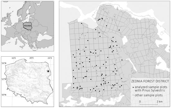 The study area is located in Northeastern Poland (Central Europe). The bottom left map presents territory of Poland with the distribution of forested areas in gray and the marked location of Zednia Forest District. The map on the right presents the ground sample plots which are distributed across the Zednia Forest District.