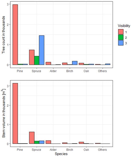Comparison of field tree count of each species in the analyzed stands distinguishing by their visibility in the context of stem volume.