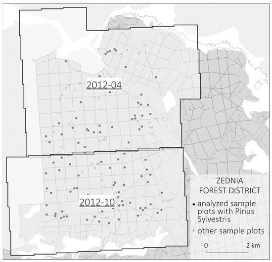 The 2012 data set was acquired in two periods—the northern part of the study area was scanned in April 2012 and the southern part in October 2012. Figure 3 presents the distribution of circular plots, including scanning ranges from April and October 2012.