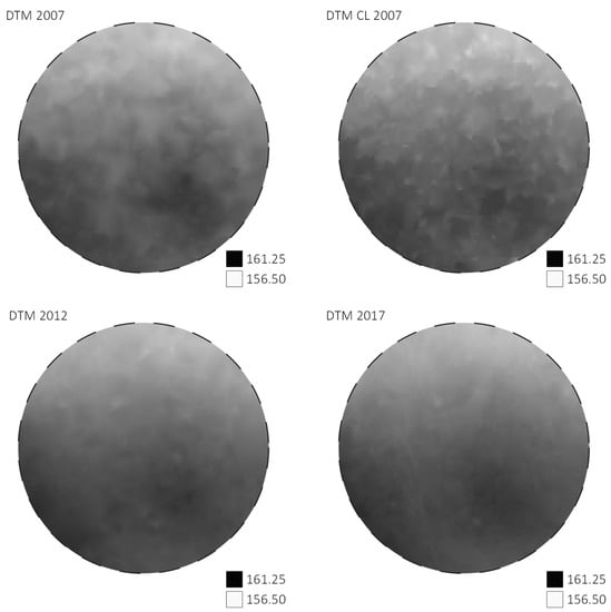 The conducted comparative analysis of mean height values in the analyzed circular plots showed the absence of statistically significant height differences between the DTMs of 2012 and 2017, where the mean height difference was indicated at the level of about 4 cm (at confidence level α = 0.05) (Figure 7). The other combinations of pairwise comparisons of DTMs models (DTM_CL2007-DTM_2012 and DTM_CL2007-DTM_2017) showed statistically significant differences in mean absolute heights, which oscillated in the range of (19,20) cm. In general, the mean height differences of the analyzed models within the SPs are relatively small, with the 2007 model being the source of the largest difference values, which could be due to the use of a sparser network of ground control points used for spatial orientation and geometric transformations of the point cloud. Very high agreement between the mean heights of the 2012 and 2017 terrain models is also evident (mean difference of 0.4 cm). The fact seems puzzling in the context of different point cloud acquisition dates. In the case of data from 2012, it was a leafless period (in accordance with the assumptions of the ISOK project), while data from the second stage of the experiment from 2017 were acquired during the leafy period (August).