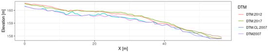 We determined the mean values of the differences between the analyzed DTMs within each plot as zonal statistics, where the computational zone was the outline of the circular plot along with a 100 m buffer. Figure 5 shows the difference in a profile of DTMs over one of the SPs.