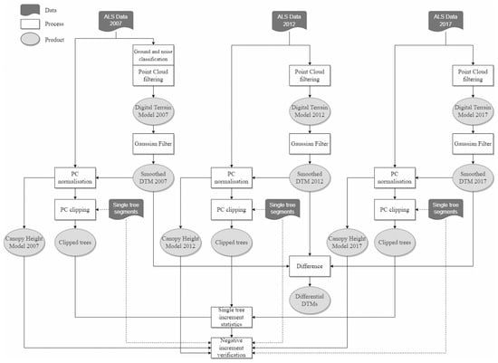We performed the tracking of changes in the height of individual Scots pine as well as the substantive verification of the obtained results according to the procedure shown in Figure 6. First, using point clouds, we generated DTMs, which were then subjected to a smoothing process using a Gaussian filter. We used the smoothed DTMs for point cloud normalization. Point cloud normalization involves the transformation of absolute coordinates of individual points (above sea level) into relative coordinates (relative to ground level). The point cloud normalization is important in the context of obtaining information about the height of individual points relative to the terrain surface. The process of normalizing the point cloud with respect to the terrain surface was realized using the lidR library in R language.