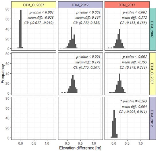 Comparison of distributions of mean elevation differences on smoothed terrain models generated based on 2007, 2012, and 2017 ALS data. * statistically significant.