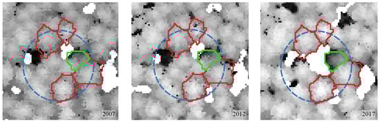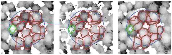 Example of a circular sample plot (blue, dashed outline) over time. We observe here a gradual death of a tree (green outline) and consequent reduction in the extent of its canopy area. Other Scot Pine trees (red outline) were not affected by this process.