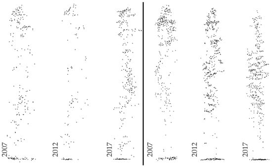 The analysis of the data showed that in most cases, the mean annual height growths of Scots pine were characterized by higher dynamics in the period 2012–2017 compared to the reference period 2007–2012. The theoretical reason for this could be an underestimation of the height of individual trees determined on the point cloud of 2012 due to lower density compared to the products of 2007 and 2017 or the influence of other factors, the variability of which was not analyzed in this study, including meteorological conditions (precipitation distribution, temperature).