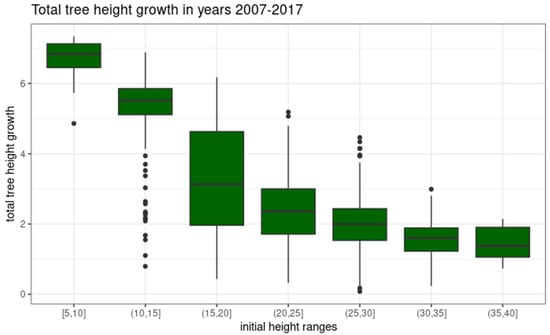 Analyzing the height growth of an individual Scots pine in the study area, we observe a natural trend: as the tree is taller at the beginning of the analyzed period its change in height is smaller (Figure 12). Taking into account all observations, it can be concluded that the increment of individual Scots pine trees in the period 2007–2017 ranged from 0.08 to 7.34 m, with an average of 2.60 m. Taking into account the height variations of trees at the time of initial observation (2007), it is possible to indicate that the average increments in the heights of Scots pine in the study area range from 1.37 m for individuals in the height range of (35,40] to 6.56 m for individuals in the height range [5,10]. Disregarding the extreme ranges of initial tree height, in which the statistical sample is of a low number, it can be indicated that the average increment in Scots pine height in the studied 10-year period ranges from 1.62 m in (30,35] to 5.25 m in (10,15] initial height ranges.