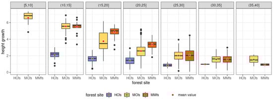 Table 1 summarizes the descriptive statistics of Scots pine tree growth analyzed in initial height ranges. As can be seen from the data summarized in Table 1, the growth of individual Scots pine trees during the analyzed period are characterized by a wide range of values. This is related to additional differentiating variables. In this study, we considered forest site group as a crucial differentiating variable.