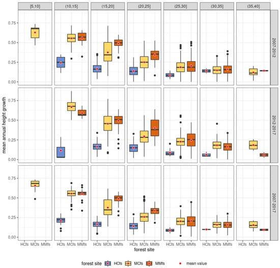 The variability in the mean annual increment in height of Scots pine in the periods 2007–2012, 2012–2017, and 2007–2017 in individual height ranges with the consideration of habitat variability is presented in Figure 14. As can be seen from the analysis of the data in the figure below, the dynamics of the mean annual increment in height of Scots pine in the 2012–2017 period is generally higher than in the 2007–2012 period and is most noticeable for the MCfs category.