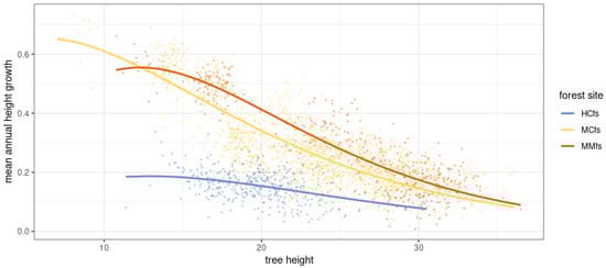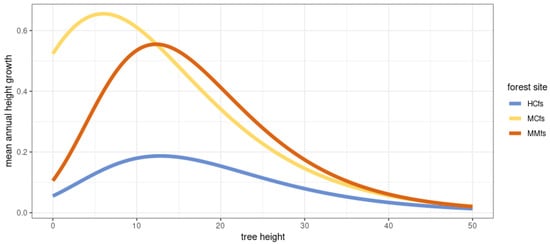 In the final part of our study, we modeled the mean annual increment in a ten-year time interval (2007–2017) as a function of the height at the beginning of the study period. A frequently used function to model growth as a function of age is the Gompertz growth curve function [,,,,]. The Gompertz curve can take different forms. In our study, we adopted its simple form: