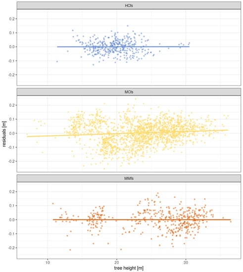 Figure 16 shows the residuals from the fitted curves. Residuals for MCfs is slightly dependent on the tree height-the trend line has non-zero slope parameter. For MMfs, the trend line of residuals given the initial tree height has a near-zero slope line.