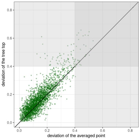 Horizontal deviations from the centroid of the segment of the highest reflection in the segment and averaged point above the 95th percentile of points’ height. The deviation is defined as the ratio of the distance between the centroid and the analyzed point and the pseudo-diameter of the tree crown-the diameter calculated from the segment area assuming circularity of the segment’s shape. The shaded area represents the distance of the point from the centroid of the segment by 0.8 pseudo-radius (0.4 pseudo-diameter).