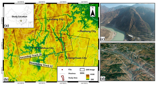The study area in this research was Baihetan dam, which is located in Ningnan County, Sichuan Province (27.04°N, 102.91°E) and Qiaojia County, Yunnan Province (26.78°N, 103.12°E). It is located at the southeast edge of the Qinghai-Tibet Plateau, with elevations between 1000 and 3000 m, and belongs to the high mountain and plateau geomorphological unit and the Transverse Mountain System in southwest Sichuan and northeast Yunnan. Due to the significant elevation difference, the study area has distinct vertical stereoclimatic features covering all climate types from southern subtropical to cold temperate zones. The area is mainly composed of river erosion landforms, tectonic landforms and ice erosion landforms, with deep river valleys and severe weathering and denudation [41]. Figure 1b shows that the reservoir area is located in the lower reaches of the Jinsha River, and the terrain is high in the east and low in the west. Moreover, the slopes along both sides of the river are steep, the mountains are high, the valleys are deep, and the river valley landforms mostly comprise “V”-shaped development, which is a typical high mountain deep canyon area. Due to impoundment, the water elevation rises dramatically, leading to landslides, mudflows, collapses and other geological hazards in the study area, so a more accurate displacement monitoring of the study area is especially crucial [42]. The real topography of the study area is shown in Figure 1c,d.