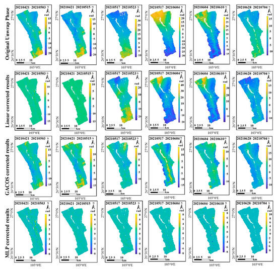 Figure 4 shows the corrective effect of the Sentinel-1 (21 April 2021 to 4 July 2021) interferogram with the three correction methods. As seen in Figure 4, there was a strong association between the interferogram phase spatial distribution and the topographic relief of the study area, indicating that the delayed vertical stratification of the atmosphere predominates in terms of the overall trend. After correction using the conventional linear model, GACOS, and MLP neural network model, the combination of the second and third rows of Figure 4 demonstrated that the topography-dependent atmospheric delay in the linear model and GACOS correction findings were attenuated to varying degrees. The analysis of the fourth row of Figure 4 revealed, however, that after the correction of the MLP neural network model, the simulated phase of the atmosphere was visibly lowered in comparison to the phase value before correction, and the phase value in the majority of places was close to 0. Thus, the MLP neural network correction had a greater impact than the linear model and GACOS.