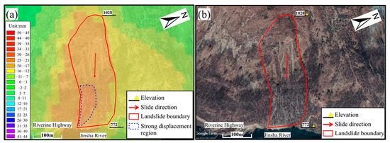 The displacement area, located near Sanjia Village, Yogu Country, Huidong County, Liangshan Yi Autonomous Prefecture, Sichuan Province, with a central longitude of 103°1′19″ and a central latitude of 26°36′59″, was further analysed. This slope elevation was approximately 772–1028 m, with a differential height of 256 m and a relatively steep slope. Combined with Figure 8a,b, the strong displacement area of this slope was more obvious (as shown by the blue dotted line), which was located in the median–lower part of the slope, with a maximum line-of-sight displacement of up to approximately 28 mm.