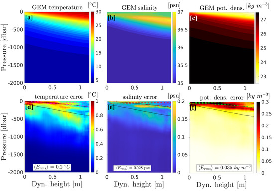 For each couple , the GEM fields provide a single value of temperature and salinity, so that the three-dimensional structure of the ocean can be inferred from any two-dimensional map of ADT. In that regard, the GEM can be thought of as a transfer function [31]. Yearly averaged GEM fields are shown in Figure 3 for temperature, salinity, and potential density (referenced to the surface). The salinity maximum between 100 and 300 dbar associated with the SUW is particularly evident in the high end of the dynamic height range. It is accompanied by a weakly stratified and warm temperature anomaly. One striking feature, also evident in the sorted raw profiles sections of Figure 2, is the smooth transition between SUW and GCW across the dynamic height range. Maps of the root mean square (RMS) errors are also provided in Figure 3d–f. For a given variable X, they are computed as , where the overbar represents the ensemble average, is the measured variable (the actual value from the ARGO profile) and is the estimated variable (the value computed using the GEM). The ensemble averages are performed over bins of 2 cm in SSH and 2 m in pressure. Error is maximum near the surface in low dynamic height water columns (GCW), and below and at the edges of, the salinity maximum. This increased uncertainty at the transition between GCW and SUW might be related to the presence of density compensated interleavings, recently reported around LCRs [29], or could as well be the consequence of a lower number of profiles (Figure 1c). The average RMS error is of 0.2 °C, 0.028 psu, and 0.035 kg m for temperature, salinity, and potential density, respectively. They are slightly larger than the values reported by Swart et al. [23], using the same methods south of Africa (0.15 °C, 0.02 psu, and 0.02 kg m).