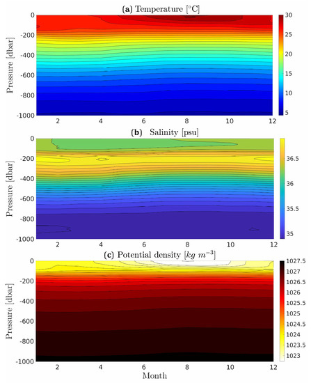 To account for the seasonality of surface conditions, which affects the accuracy of the three-dimensional reconstruction in the top 200 dbar, the GEM fields were constructed on a monthly basis. Figure 4 shows a Hovmuller diagram of the temperature, salinity, and potential density GEM for a dynamic height of 80 cm. Seasonal variations of temperature, potential density, and mixed layer depth are evident near the surface. Salinity is less affected by the seasonal cycle. Note that the error was also computed individually for each monthly GEM, and we found no large seasonal variation of the error (range (0.19–0.22) °C for temperature and (0.017–0.019) psu for salinity).