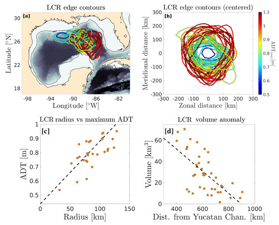 The LCR detection method is based on daily ADT maps. First, the edge of the LC is defined as the ADT contour passing through both the Yucatan Channel and the Florida strait, along which the mean velocity is maximum. An LCR is detected when this contour forms a closed loop. However, recently detached LCRs may reattach to the LC, and repeated detachment-reattachment sequences are not rare [32]. Here, we only take into account LCRs that permanently detached from the LC. After detachment, the LCRs edge is defined as the closed ADT contour along which the mean azimuthal velocity is maximum. The maximum velocity contour coincides with a sign-change of the Okubo–Weiss parameter [20,33], so that our edge definition criterion ensures that only the vorticity-dominated portion of the eddy is retained, while the strain-dominated periphery is discarded. For comparison purposes, and because the last closed SSH contour is a commonly used definition for eddies boundaries, the latter was also computed and briefly discussed. Between January 1993 and January 2022, 40 LCRs were detected. A map of their edge contours is shown in Figure 5a. The maximum ADT value at their center is color coded. The location of newly detached LCRs exhibit a large zonal and meridional variability. The same edge contours are plotted in an eddy-centric frame in Figure 5b, showing that LCRs have a wide range of sizes. Figure 5a,b also show a clear tendency for smaller LCRs and for LCRs shed at the tip of the LC (the north-western most eddies) to have a weaker ADT signal. These tendencies are explored further in Figure 5c,d, showing a nearly linear relationship between LCRs maximum ADT and their radius, and between their volume anomaly (surface integral of the ADT anomaly) and their distance from the Yucatan channel.