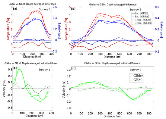 (a,b): Horizontalprofiles of depth-averaged temperature (red) and salinity (blue) anomalies. The glider observations are plotted as dotted lines, while the GEM-reconstructed profile is plotted as plain lines. The difference between the glider and GEM sections are plotted as dotted lines. (c,d): Same as (a,b) for the geostrophic velocity.
