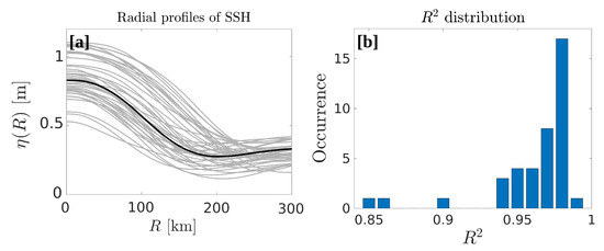 (a): Radial profiles of sea surface height (SSH) for the 40 detached Loop Current rings (LCRs) (gray lines) and mean universal SSH profile (Equation (3)) computed using the mean parameters of the 40 least-square fits (black line). (b): Coefficient of determination () of the observed SSH profiles and the fitted universal profiles.