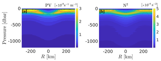 A section of Ertel’s potential vorticity (PV) is shown in Figure 13a. In cylindrical coordinates, PV is defined as: