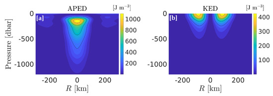 To conclude this description of the vertical structure of an average LCR, the distribution of mechanical energy density is shown in Figure 14. Kinetic energy density (KED) and available potential energy density (APED) are defined following Holliday and McIntyre [37]: