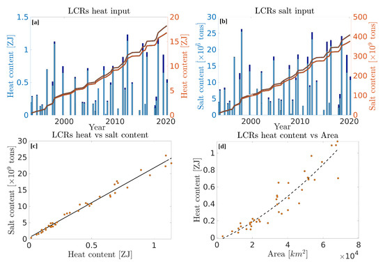 where is a surface element, is the specific heat of sea water, is the mean density, is the temperature anomaly, defined as the difference between the temperature and the GoM’s mean profile , and is salinity anomaly (in kg m), defined using the same procedure as for temperature anomaly. Heat and salt contents of the 40 detected eddies are shown on the bar plots of Figure 15a,b for two different eddy boundary criteria (maximum velocity contour and last closed ADT contour) and are compared against each other on Figure 15c. The average heat content of an LCR is of 0.42 and 0.46 ZJ for the maximum velocity contour and the last closed contour boundary criteria, respectively, while the average salt content is of 9.43 and 10.24 billion tons. Heat and salt are extremely variable from one eddy to the other, with a range spanning nearly 2 orders of magnitude ((0.017–1.14) ZJ for heat and (0.38–25.5) billion tons for salt). There is a solid proportionality relationship ( = 0.98) between heat and salt contents (Figure 15c), in agreement with Meunier et al. [20]. The cumulative heat and salt input into the GoM were also computed between 1993 and 2022, and are shown as the orange lines in Figure 15a,b. Despite the large variability of LCRs heat and salt contents, and the lack of periodicity in eddy detachment events, the cumulative heat input grows nearly linearly with time, with a growth rate of 0.60 ZJ per year for heat and 13.5 billion tons per year for salt (coefficient of determination for both heat and salt linear fits). It is also interesting to note that the individual heat contents of LCRs do not grow linearly with their surface area, but rather quadratically (Figure 15d), which might be attributed to the fact that larger eddies also have larger maximum SSH anomalies, hence, not only larger areas, but also larger heat content anomalies per unit area.