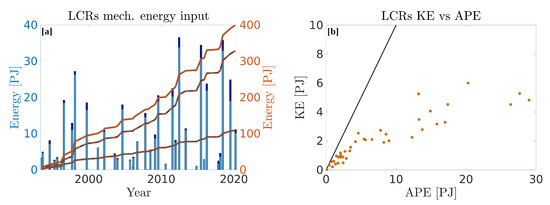 Similar to the heat and salt contents discussed above, the total energy carried by each individual LCR is shown in the bar plot of Figure 16a. The cumulative energy is plotted for KE, APE, and total mechanical energy (TE = KE + APE), while the individual energy contents (bar plot) is only shown for TE, for the sake of clarity. Total mechanical energy has an average of 10.0 (10.9) PJ per eddy when defining the eddies boundaries as the maximum velocity contour (last closed contour). They also exhibit a wide range of values with nearly two orders of magnitudes between the less energetic and the more energetic eddies ((0.15–36.6) PJ). On average, APE is 3.8 times larger than KE. This bias in the energy partition is particularly evident in Figure 16b, which shows KE against APE for each detected LCR. The black line represent equipartition (Burger number unity). Although APE dominates over KE in all LCRs, the ratio between KE and APE (Burger number) decreases as the LCRs total energy increases: large eddies have very small Burger numbers, while smaller eddies can get closer to energy equipartition. The growth of cumulative energy is also nearly linear, with values of 2.95 and 11.2 PJ per year for KE and APE, respectively ( = 0.99 for KE and 0.97 for APE).