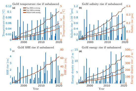 where represents weather the full water volume of the GoM, or that of the top 2000 or 1000 m. The equivalent sea level rise is computed as the difference between the steric height associated with the mean GoM temperature and salinity ( and ), and the steric height associated with the hypothetical increased temperature and salinity ( and ). The hypothetical (unbalanced) impacts of each individual LCR, as well as their cumulative impacts over time on temperature, salinity, SSH, and energy density are shown in Figure 17. For the sake of clarity, only hypothesis (a) (redistribution of tracers over the entire GoM volume) is shown in the bar graphs, while the three scenarios are plotted for the cumulative effects. Because of the heterogeneity of LCRs heat, salt, and energy content, the hypothetical unbalanced response of the GoM to individual eddies is highly variable. On average, mixing of a mean LCR into the whole GoM, the top 2000 m, or the top 1000 m would result in a rise of 0.04, 0.06, and 0.10 °C of the GoM’s mean temperature, respectively (Figure 17a). For the largest LCRs, these values reach up to 0.12, 0.16, and 0.28 °C. Looking at the cumulative effects of LCRs, between 1993 and 2021, if unbalanced by surface heat fluxes, the GoM’s mean temperature would have risen by 1.71, 2.42, and 4.23 °C in the whole GoM, top 2000 m, and top 1000 m mixing scenarios, respectively.