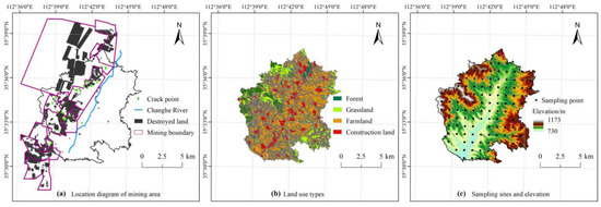 The Changhe Basin is located in Jincheng city, China (112.63°–112.77°N, 35.50°–35.63°E), and extends over an area of approximately 113.16 km2 (Figure 1). The land cover primarily includes forests, grassland, farmland, and construction land. The annual average temperature in the Changhe Basin is 10.6 °C, and the annual precipitation is 550–600 mm. On the west side of the Changhe river, there are 11 coal mines, including Chengzhuang, Tiantai Kunda, and Tian’an Jinrui, with a total of 8–17 layers of coal and a total thickness of 9.18–14.23 m. The scope of the mining permit is from 2010 to 2030, the mining method is underground mining, and the total annual coal production is more than 450,000 tons. Since 2010, large-scale land degradation such as goaves, subsidence, and cracks have occurred. As of 2015, the area of land damage has reached 10.29 km2, resulting in serious environmental problems, such as reduced vegetation cover and soil and water pollution.
