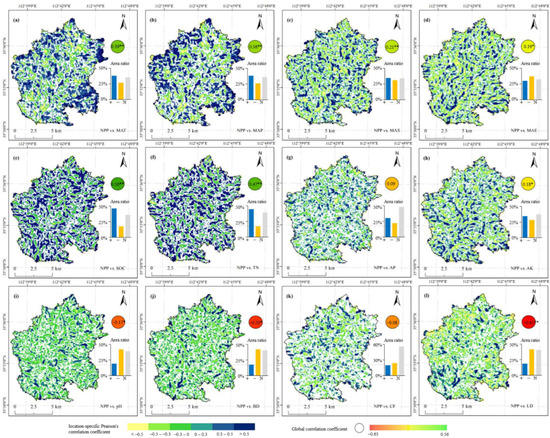 Spatial distributions of the location-specific Pearson’s correlation coefficient between NPP and drivers. (a) MAT, (b) MAP, (c) MAS, (d) MAE, (e) SOC, (f) TN, (g) AP, (h) AK, (i) pH, (j) BD, (k) CF, and (l) LD. All abbreviations (BD, CF, MAT, SOC, etc.) can be found in Table 1. The right inset shows the area ratios of positive, negative, and insignificant areas. ** means significant at p < 0.01 level, * means significant at p < 0.05 level.