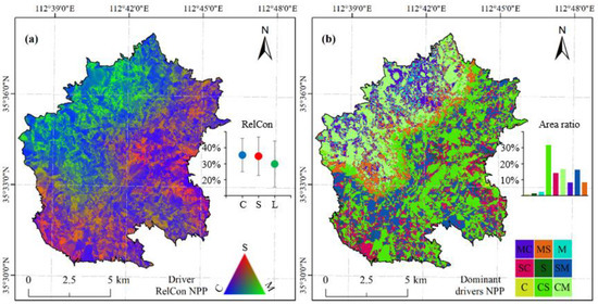 Relative contribution of different categories of driving factors to the spatial variation of NPP in the Changhe Basin mining area. (a) Spatial distribution map of the relative contributions of climate (C), soil properties (S), and mining activities (M) to NPP variability. (a) The right inset represents the average relative contribution of different categories of drivers, and whiskers represent the standard deviation of all pixel values. The right inset of (b) represents the proportion of control area that dominates the driver. C, S, and M in (b) represent climate, soil properties, and coal mining activities, respectively. The combination of C, S, and M indicates that the coupled effects of different categories of drivers dominate the spatial variation of NPP. For instance, CS (SC) represents the coupled effects of climate and soil properties, with a larger relative contribution from the former drivers. CM (MC): the combined effects of climate and mining activities, SM (MS): the combined effects of soil properties and mining activities.