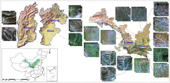There are some existing public remote sensing imagery datasets with different spatial resolutions and abundant surface features. One dataset (https://github.com/MountainAndGhost/remote-sensing-images-registration-dataset, accessed on 27 September 2020) consists of three subdatasets, including 396 pairs of images with a spatial resolution of 0.23 m, 420 pairs of images mainly covering farmland regions with a 3.75 m spatial resolution, and the last one with a 30 m resolution containing 165 pairs of images. All images to be registered are simulated; that is to say, the sensed image is produced by transforming the reference image with a specified matrix. It cannot accurately represent the real deformation of two raw satellite imageries. The ISPRS IKONOS dataset (https://www.isprs.org/data/ikonos/default.aspx, accessed on 29 March 2021) provides one bitemporal pair of high-resolution () images, only covering the urban region with dense high-rise buildings. Differing from them, the real remote sensing images covering mountainous regions have more complex and varied deformations, which cannot be described using these existed datasets. Thus, we construct a real mountainous remote sensing imagery dataset with dozens of multitemporal Gaofen-2 satellite image pairs.