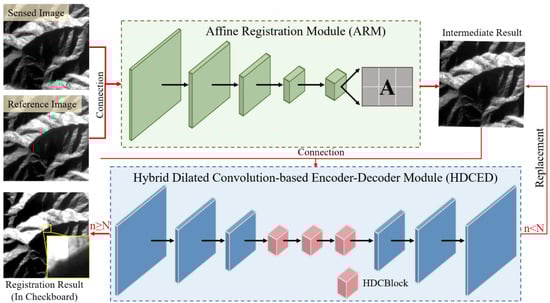 - Then, a coarse-to-fine unsupervised cascading convolutional network is developed, consisting of an affine registration module (ARM) and an iterative hybrid dilation convolution-based encoder–decoder (HDCED) module. The entire network is trained in an end-to-end manner, and the previous result is always connected to the reference image as the input of the subsequent process.