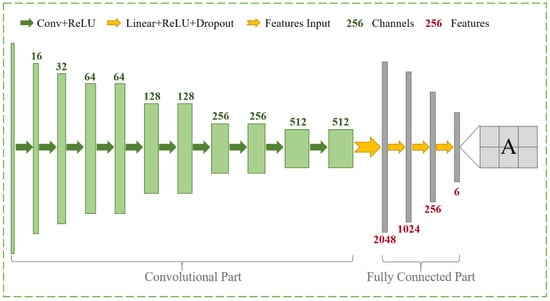 As illustrated in Figure 4, the convolution part is employed to gradually downsample the input feature maps and capture the high-level semantic features. The fully connected (FC) layers regress the affine transformation matrix. The ten convolutional layers consist of the convolution parts, and each layer is followed by a nonlinear activation function of the rectified linear unit (ReLU) [52]. Unlike the general setting, the convolution stride equals two at the different scales in this paper, instead of the pooling layers used to reduce the size of the feature map by half [53]. With the reduction in the image scale, the number of feature channels containing high-level semantic information gradually increases. Subsequently, the learned features are delivered to the FC part, consisting of four layers. In the first three layers, the input features are successively linearized to the specified ReLU and dropout function [54]. It is worth noting that the dropout function can randomly delete some nodes in the training stage, avoiding overfitting, especially for a complex network with a small dataset [55]. The last FC only contains the linear layer used to transform the previous features into six parameters for further regression of the transformation model. The six output numeric parameters represent a transform matrix and a translation matrix. Concretely, the former depicts the rotation, scaling, or shearing transformation, and the last one is the translation vector of the x- and y-directions. With the regressed transformation matrix A, the pixel-by-pixel displacement field is defined as: