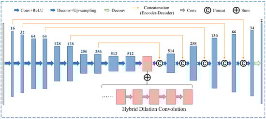 The encoder network is the same as the convolutional part of the ARM, which involves downscaling the input feature image gradually and capturing the high-level semantic information. The decoder network is designed to upscale the input feature maps and recover the spatial information progressively. It consists of six layers and is symmetrical to the encoder network. The deconvolutional layers are learned to expand the input size and reduce the number of input feature channels. Therefore, each deconvolutional layer contains elements from three aspects, including the deconvoluted feature maps, the upsampled one, and the feature maps from the encoder subnetwork of the same scale, which is the skip connection, as we know. The channels of the feature map are labeled on the head of each layer at the encoder and decoder stages, as shown in Figure 5. The submodule will output the per-pixel displacement field, using a feature map with two channels (displacement for the x- and y-directions) of the same size as the input. Especially the pink part is prominent, consisting of five stacked HDC blocks.