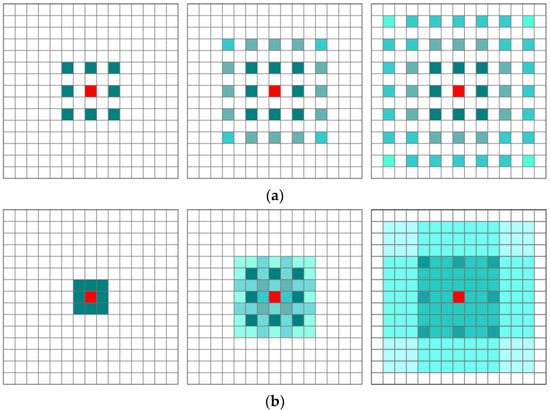 Dilated convolutions are important for image processing tasks, as they enlarge the receptive fields of the network without downsampling or increasing the number of model parameters [56], as shown in Figure 6a. However, the gridding effect is apparent with increasing dilation rates, expanding the receptive fields of output neurons [57]. Moreover, using large dilation rate information may only be beneficial for some large regions, and it may demonstrate disadvantages for small objects and may miss some detailed information [56]. To make full use of the image information, borrowing the idea in [58], we adopted an HDC block in the encoder–decoder network. The HDC utilizes the general convolution operation to further learn the abstract features in detail, as shown in Figure 6b. Although the operation principle is the same, the dilation rate of the HDC is not invariable. The dilation rate in this paper consists of five subsequent convolutional layers with dilation rates of 1, 3, 5, 7, and 11, respectively.